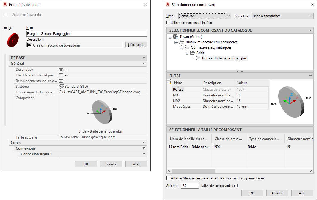 Conseil : Sélectionnez Utiliser un type composant indéfini afin de désactiver les sélections de composants dans cette boîte de dialogue. Cette sélection crée un outil sans propriétés spécifiques dans la palette d'outils. Vous pouvez utiliser ce nouvel outil pour activer la commande d'ajout de raccord lors du positionnement de la conduite.