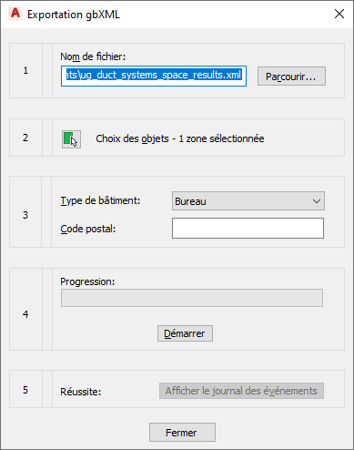 Une fois les espaces créés et regroupés sous forme de zones, vous pouvez exporter les informations dans un fichier au format gbXML, comme suit.