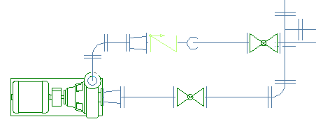 Dans l'exemple suivant, les raccords (tés, coudes et réductions) sont conformes à leurs cotes d'enveloppe réelles. Une vanne d'isolement et un clapet de retenue s'affichent en tant que composants à l'échelle 1D et la pompe s'affiche à l'échelle 2D.