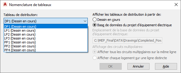 - Dans la zone Afficher les tableaux de distribution à partir de, cliquez sur l'option Base de données du projet électrique, puis cliquez sur OK.