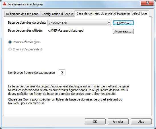 - Dans la boîte de dialogue Préférences électriques, cliquez sur l'onglet Base de données du projet d'équipement électrique.