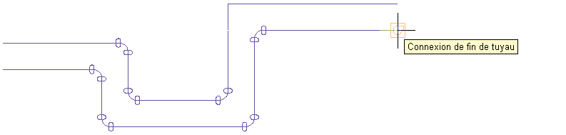 En ce qui concerne les coudes et les autres raccords à courbe, vous pouvez constater qu'une connexion de courbe du tuyau est affichée au niveau de l'intersection logique des traits d'axe de raccord. Vous avez ainsi la garantie que le tuyau est décalé correctement sur toute la longueur de la conduite.