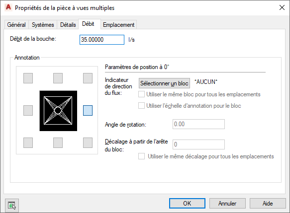 Il est possible de préciser jusqu'à huit emplacements d'indicateurs de direction du flux autour du régulateur d'air. Vous pouvez sélectionner le bloc concerné par l'indicateur de direction du flux et utiliser éventuellement le même bloc pour tous les indicateurs de direction du flux, ou sélectionner des blocs différents selon leur emplacement. Indiquez l'angle de rotation et le décalage par rapport au régulateur d'air pour chaque indicateur de direction du flux et précisez la valeur du flux.