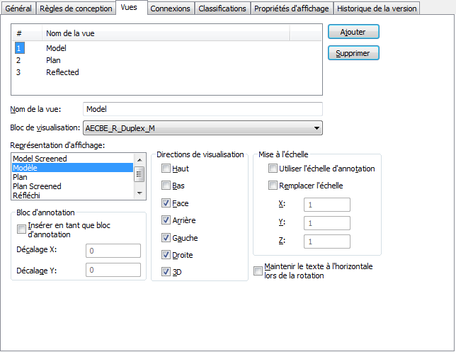 En définissant plusieurs vues avec la même représentation d'affichage et les mêmes directions de visualisation spécifiées, vous pouvez d'une part afficher simultanément un objet à l'aide de blocs de visualisation annotatifs et non annotatifs, d'autre part configurer différemment les propriétés d'affichage des blocs de visualisation. Par exemple, un style de boîte de dérivation peut nécessiter un premier bloc de visualisation pour représenter les symboles et un second bloc de visualisation pour représenter l'annotation. Cela vous permet de définir l'aspect du bloc de visualisation annotatif en configurant le composant d'affichage d'annotation pour la boîte de dérivation et de définir l'aspect du symbole en configurant les autres composants d'affichage de la boîte.