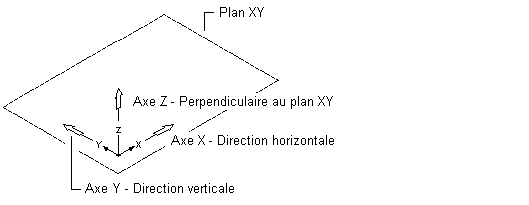 Dans ce mode, l'ajout de lignes et de symboles schématiques s'effectue dans un système de coordonnées général (SCG). Ce système est composé de trois axes : un axe horizontal (axe X), un axe vertical (axe Y) et un axe perpendiculaire au plan XY (axe Z).