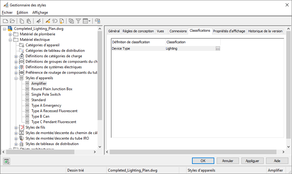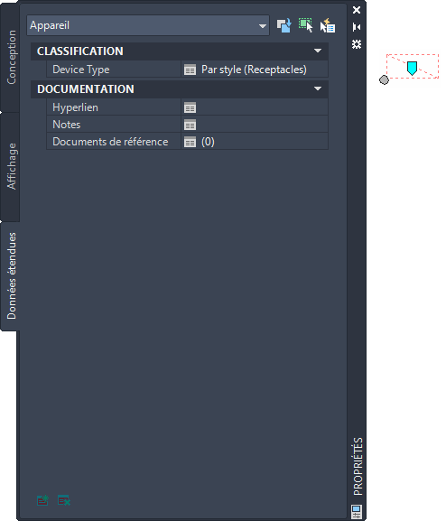 Les appareils d'un dessin constituent des occurrences de style d'appareil. Dès lors, ils sont associés à une propriété pour chaque définition de classification dans le style d'appareil. L'onglet Données étendues de la palette des propriétés permet d'afficher ou de remplacer la classification d'un ou plusieurs appareils du dessin.