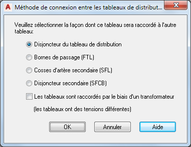 | Les tableaux de distribution sont raccordés par le biais d’un transformateur (les tableaux ont des tensions différentes) | Le tableau de distribution est raccordé par le biais d’un transformateur lorsque les tableaux ont des tensions différentes. |