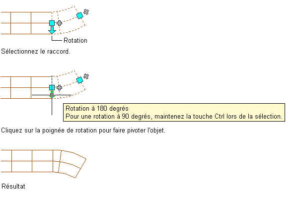 Lorsque vous faites pivoter un raccord relié à d'autres objets, ces objets sont ajustés de manière à préserver la connectivité. Par exemple, la longueur des segments raccordés sera peut-être légèrement modifiée suite à l'inversion de l'orientation du raccord. Si les objets ne peuvent pas être ajustés, ils sont déconnectés.