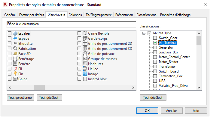 Les classifications permettent de trier les objets en créant des styles de classification contenant des valeurs personnalisées. Ces styles de classification sont stockés dans le style d'objet. Ils permettent d'afficher les objets et de les associer aux nomenclatures. Jeu d’outils AutoCAD MEP 2027 classifie automatiquement les objets, tels que les pièces à vues multiples et les raccords. Dès lors, lorsque vous insérez un régulateur d'air dans le dessin, cet objet est catégorisé en tant que pièce à vues multiples associée au type Régulateur_Air. Vous pouvez ainsi créer une nomenclature contenant uniquement les régulateurs d'air (sans inclure l'ensemble des pièces à vues multiples du dessin).
