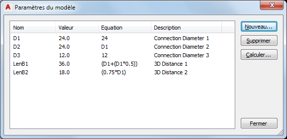 - Cliquez deux fois sur la valeur Equation associée à LenB1, puis tapez l'équation équivalant au diamètre de la conduite plus un demi diamètre de la conduite (D1 + ( D1 * 0.5)).