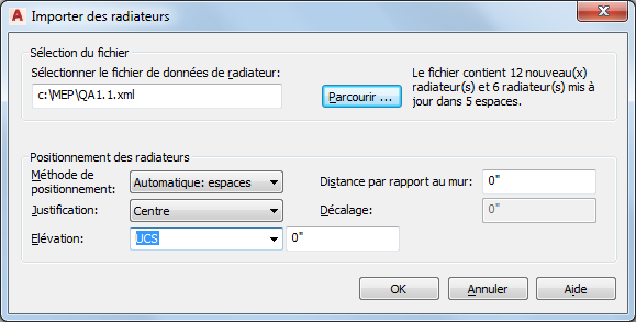 Vous pouvez ajouter des radiateurs à un dessin à l'aide des données d'un fichier XML produites par un programme de calcul des charges de chauffage tel que SOLAR COMPUTER Desktop. Le fichier XML contient un identifiant pour un ou plusieurs espaces dans le modèle. Chaque identifiant d'espace dans le fichier précède une liste des radiateurs devant être placés dans l'espace.
