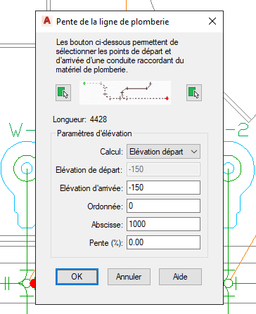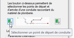 Dans la boîte de dialogue Pente de la ligne de plomberie, cliquez sur Sélectionner un point de départ de conduite ou sur Sélectionner un point d'arrivée de conduite.