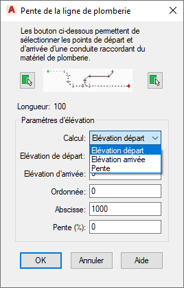 L'outil d'inclinaison de la ligne de plomberie permet de calculer l'élévation de départ, l'élévation d'arrivée ou la pente d'une ligne de plomberie.