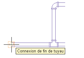 Lorsque vous dessinez un tuyau, vous pouvez utiliser des accrochages aux tuyaux pour connecter un tuyau, un raccord ou une pièce à vues multiples directement à une connexion de fin de tuyau située à l'extrémité d'un segment de tuyau. Vous pouvez également raccorder des connexions de courbe de tuyau situées à tout niveau d'un segment de tuyau.