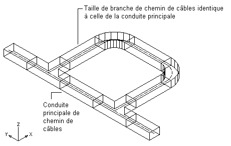 Une fois les conduites de chemin de câbles ou de tube IRO dessinées, vous pouvez former un réseau en les reliant par des branches. Vous pouvez utiliser les accrochages Jeu d’outils AutoCAD MEP 2027 pour faciliter la recherche des points de connexion sur les objets du dessin.