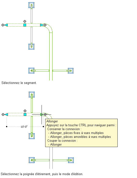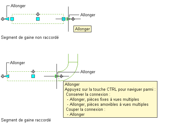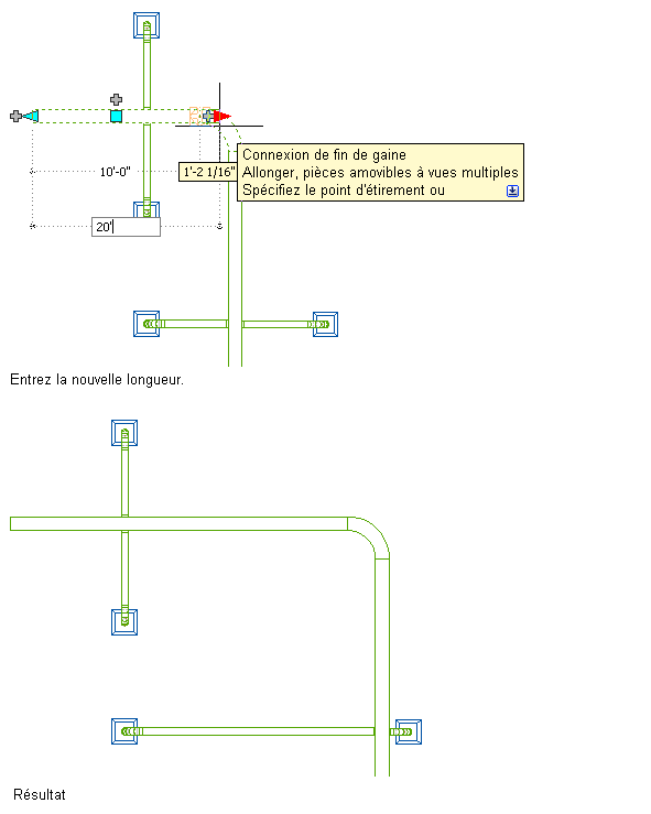 Si vous utilisez la poignée d'extension située au niveau d'une extrémité raccordée à un autre objet, vous devez indiquer si Jeu d’outils AutoCAD MEP 2027 doit conserver la connectivité entre les objets une fois la longueur modifiée.
