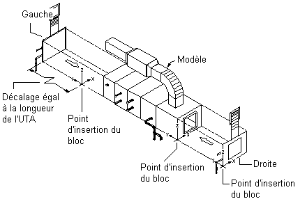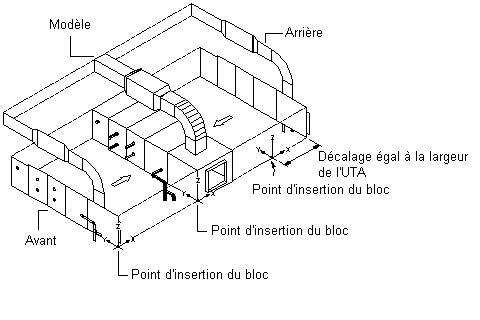 Les illustrations précédentes montrent le point d'insertion de la vue de modèle au coin droit du bord inférieur de la face avant. Le point d'insertion des vues de dessus et de dessous se situe au niveau du coin droit du bord avant et son décalage correspond à la hauteur de l'unité de traitement d'air. Le point d'insertion des vues de face et arrière se situe au niveau du coin droit du bord inférieur et son décalage correspond à la largeur de l'unité de traitement d'air. Le point d'insertion des vues de gauche et de droite se situe au niveau du coin inférieur avant et son décalage correspond à la longueur de l'unité de traitement d'air.