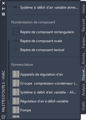 Les outils de repères de composants permettent de numéroter les différentes étiquettes séparément ou sous forme de séquence. Les composants de même type peuvent être associés au même numéro. Les repères de composants peuvent contenir des numéros ou du texte et peuvent s'utiliser avec tous les objets MEP. En revanche, les outils de nomenclature de la palette d'outils Etiquette et nomenclature s'utilisent uniquement avec les systèmes de gaines et de tuyauterie. Pour plus d'informations, reportez-vous à la rubrique Utilisation des repères de composants et des nomenclatures.