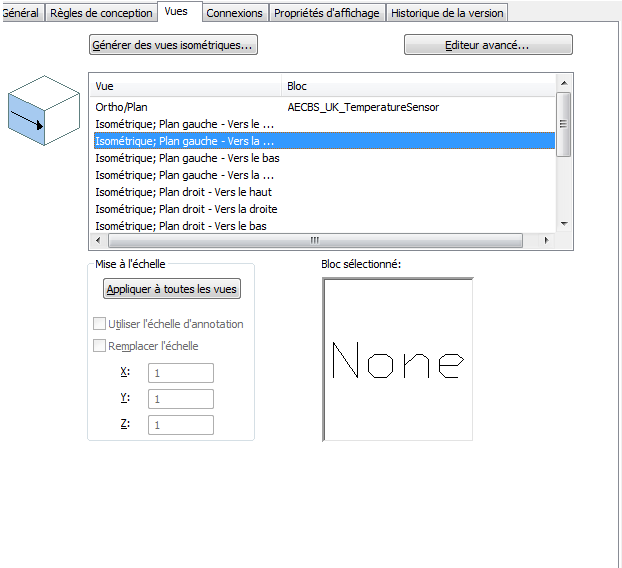 Le logiciel crée les vues isométriques et les blocs de visualisation associés en fonction du bloc sélectionné pour la vue orthogonale (plan).