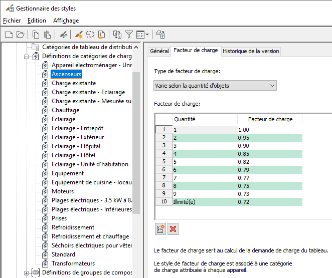 Chaque facteur de charge est associé à une valeur multipliée par la charge pour déterminer la demande d'une catégorie de charge. Il est important de définir une demande de charge de manière à éviter toute surcharge du circuit. La définition d'un facteur de charge permet également d'obtenir un réel calcul de la demande de charge estimée.
