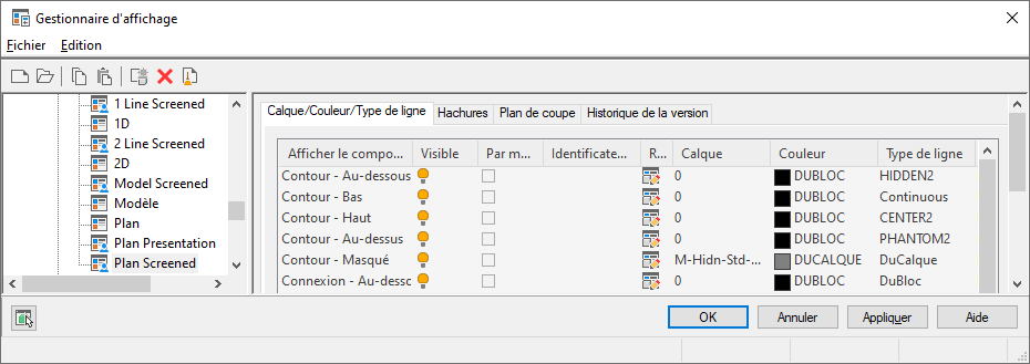 Les paramètres d'affichage différencient les objets au-dessus ou en-dessous de l'intervalle d'affichage. Vous pouvez par exemple définir des types et des couleurs de ligne de sorte qu'ils s'affichent différemment en fonction de l'élévation. Vous pouvez également utiliser les paramètres d'affichage pour masquer un objet en fonction de son élévation. Masquer des objets peut s'avérer utile lors de la création de documents de construction pour un plan d'étage spécifique à partir d'un modèle de plusieurs étages.