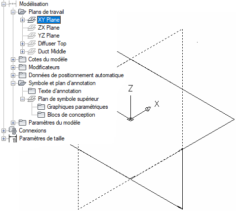 Les plans de travail ZX, YZ et XY sont créés.