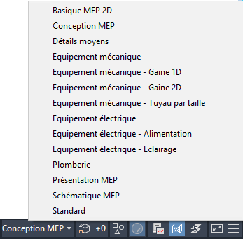Jeu d’outils AutoCAD MEP 2027 utilise des vues orthogonales et isométriques dans les dessins, mais contient également de nombreux paramètres d'affichage qui déterminent la manière dont s'affichent les objets dans un dessin. Les représentations d'affichage déterminent l'affichage des objets dans les différentes vues. Les configurations d'affichage désignent des groupes de représentation d'affichage conçus pour des tâches spécifiques. Par exemple, vous pouvez transformer une configuration d'affichage 1D en configuration d'affichage 2D. Vous pouvez également définir des configurations d'affichage spécifiques aux différentes disciplines. Par exemple, vous pouvez définir une configuration d'affichage représentant les systèmes mécaniques dans une couleur et un type de ligne donnés tout en masquant les autres types de systèmes.