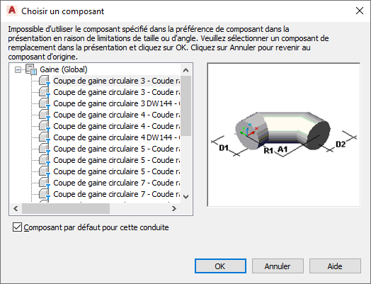 La boîte de dialogue Choisir un composant s'affiche en cas de tentative d'ajout ou de modification d'un composant non stocké dans les préférences. Vous serez invité à effectuer une substitution à partir du catalogue. L'exemple suivant montre la boîte de dialogue dans le domaine de Réseau de gaines du profil global :