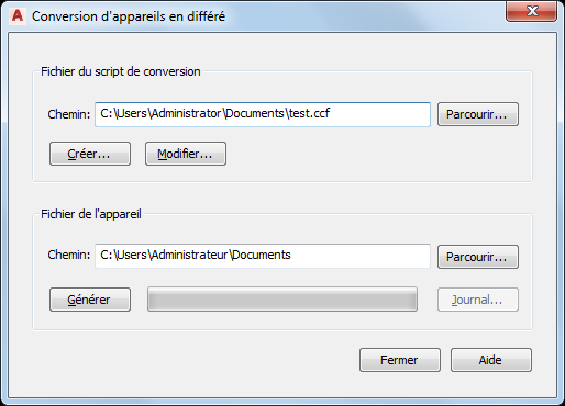 | créer un script | Cliquez sur Créer, puis créez le script à l'aide de la boîte de dialogue Script de conversion de l'appareil. Pour plus d'informations, reportez-vous à la rubrique Création de scripts de conversion de l'appareil. |