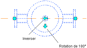 La poignée de rotation fait pivoter un composant de 180 degrés. La poignée d'inversion oriente un composant (pièce à vues multiples intégrée ou ancrée, raccord ou piquage) suivant la direction du flux.