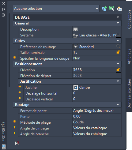 Il s'agit des propriétés de l'onglet Conception de la palette des propriétés que vous utilisez pour l'ajout d'objets de tuyauterie.