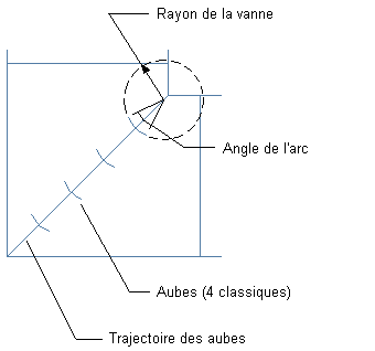 | angle de l'arc | détermine la taille de l'arc de l'aube par rapport au chemin circulaire définissant l'aube ; par exemple, la valeur 45 degrés correspond à 1/8 du chemin circulaire. |