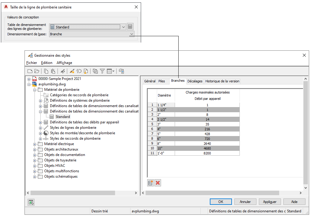 Lorsque vous définissez la conduite sanitaire en tant que branche, le logiciel effectue le calcul de dimensionnement à l'aide des informations de l'onglet Branches de la table de dimensionnement de ligne de plomberie sanitaire (table de dimensionnement des canalisations), dont les définitions se trouvent dans le gestionnaire des styles.