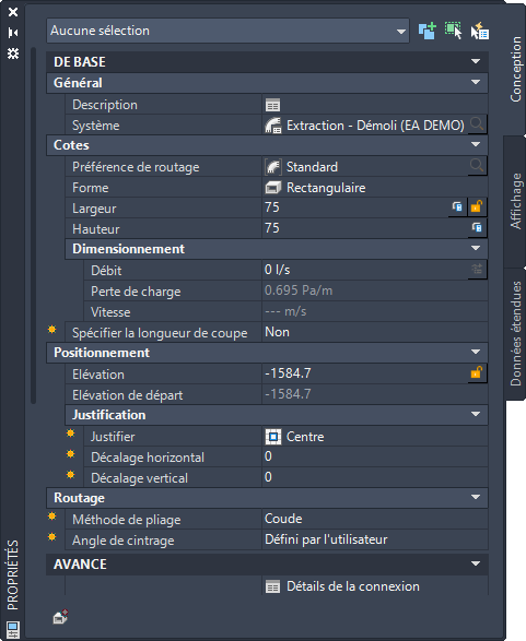 | **Graphiques | Choisissez si vous voulez ajouter des aubes au raccord de gaine ou non. Remarque : Pour plus d'informations, reportez-vous à la rubrique Dessin d'une gaine flexible.