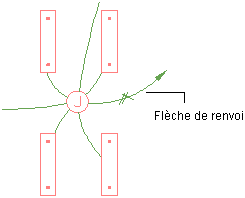 Une flèche de renvoi désigne une représentation graphique des fils reliant un circuit à l'emplacement central défini en tant que point de distribution de l'alimentation (en principe, un tableau de distribution). Il n'est pas nécessaire de raccorder la flèche de renvoi au tableau de distribution. Il est d'usage de se contenter de la dessiner en direction du tableau de distribution.