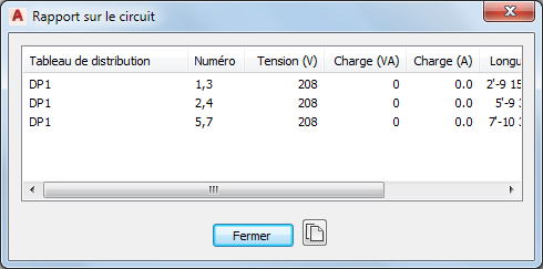 L'affichage d'informations concernant un circuit donné d'un dessin peut faciliter la création de nomenclatures de conception électrique. Les rapports de circuit permettent d'afficher le nom de tableau de distribution, le nom de circuit, la tension, la charge (exprimée en VA), la longueur de circuit et le nombre d'appareils assignés pour un ou plusieurs circuits.