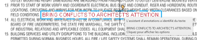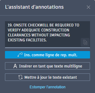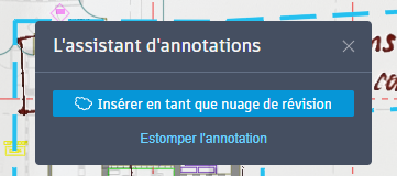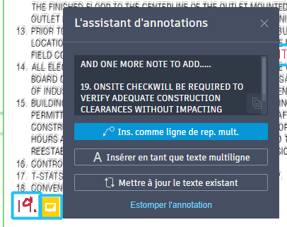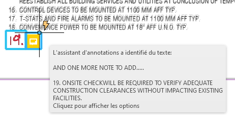 Avec l’assistant d’annotations, vous pouvez agir sur les annotations que vous importez. L’assistant d’annotations peut identifier du texte, du texte barré, des lignes de repère, des nuages de révision, du texte d’instruction et des commentaires PDF. Lors d’une action sur une annotation,comme l’insertion d’un nuage de révision ou d’un texte multiligne, l’objet est ajouté au dessin et non au tracé.