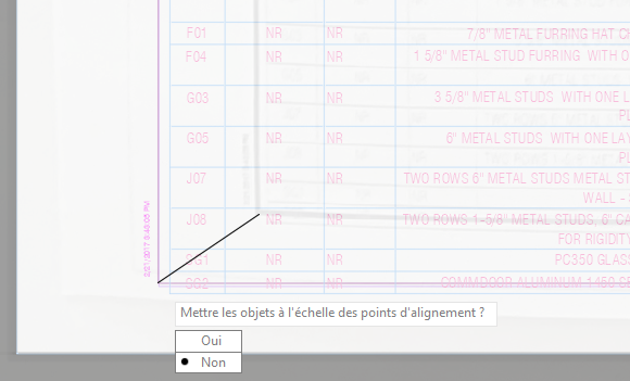 Sélectionnez Aligner dans le menu. Pour aligner, sélectionnez deux paires de points source et de destination. Les points source se trouvent sur l’annotation et les points de destination sur le dessin.