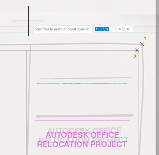 Lorsqu’il vous est demandé d’indiquer le premier point de destination, cliquez sur le coin supérieur droit du cartouche du dessin (2).