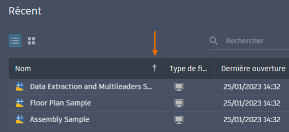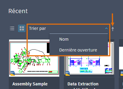 La liste des dessins récents utilise des miniatures plus petites pour permettre l'affichage de plusieurs dessins. Vous pouvez désormais trier et rechercher les dessins récents dans les vues sous forme de grille et de liste.