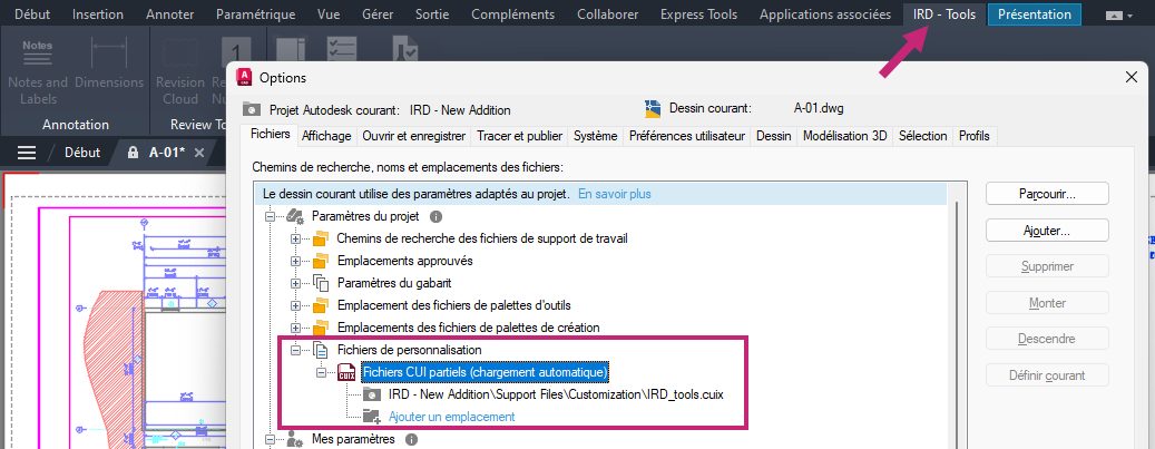 Ajout d’un fichier de personnalisation partielle (CUIx) aux paramètres d’un projet Autodesk