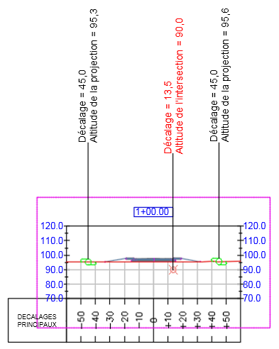 Vous pouvez à la fois afficher les projections et les intersections dans les dessins de profils en travers.