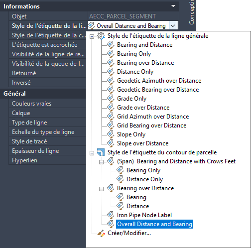 Dans l'exemple suivant, notez qu'en plus des styles de l'étiquette de contour de parcelle, le style de l'étiquette de la ligne générale est disponible lors de la modification d'une étiquette de ligne de parcelle.