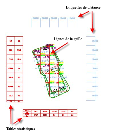 Vous pouvez utiliser la commande Production du plan de terrassement pour insérer des étiquettes dans une grille et des tables qui contiennent des informations sur le volume du terrassement entre deux surfaces triangulées. L'illustration suivante montre un exemple de la grille, des étiquettes et des tables qui sont insérées dans un dessin à l'aide de cette commande.