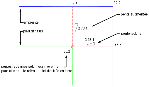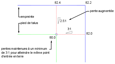 Conserver la pente au minimum : conserve le talus ou la pente indiqués comme minimum et augmente la pente projetée à partir de l’empreinte d’un côté.