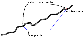 Surface : indique que les lignes de projection du talus seront prolongées à partir de l’empreinte, jusqu’à ce qu’elles atteignent la surface. Vous êtes invité à sélectionner une surface cible lorsque vous créez un talus utilisant ces paramètres.