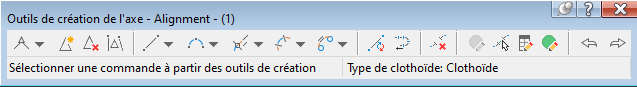 Le nom du segment sélectionné s'affiche en haut de la barre d'outils. Lorsque vous cliquez sur une icône, l'option en cours s'affiche en bas de la barre d'outils. La barre d'outils reste ouverte lorsque vous modifiez l'axe à l'aide des poignées ou entrez une autre commande. Elle se ferme lorsque vous supprimez l'axe sélectionné ou que vous cliquez sur le bouton X dans le coin supérieur droit de la barre d'outils.