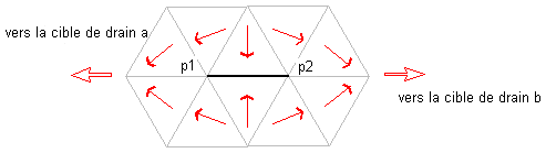 Ce type de bassin versant est appelé rupture du réseau de drainage, car l'eau s'écoulant dans l'entaille formée à partir de p1 et p2 pourrait se déverser dans la cible de drain “a” et “b” comme représenté dans l'illustration suivante :