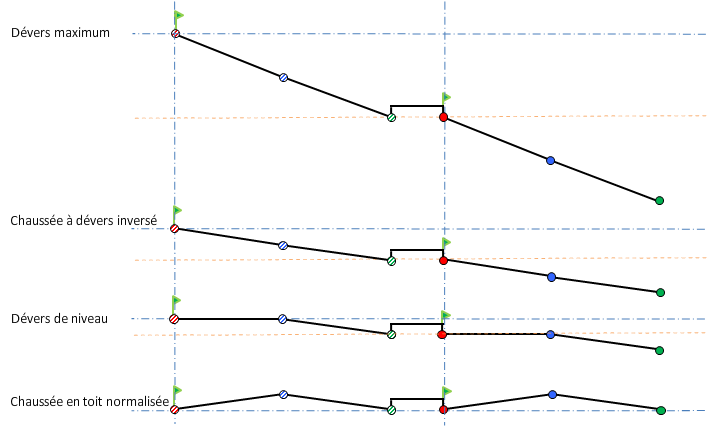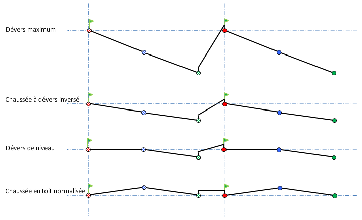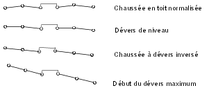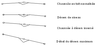 Cette section décrit des cas de route divisée et montre comment le dévers est appliqué dans chacun d'eux.