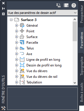 La fenêtre d'outils peut afficher jusqu'à quatre onglets : Prospecteur, Paramètres, Topographie et Boîte à outils. La fenêtre Panorama affiche des onglets nommés si plusieurs vues sont actives dans cette fenêtre.